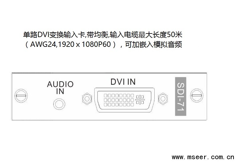 SDI-71 DVI 單通道變換輸入卡,配合SMD主機(jī)使用,采用獨(dú)立板卡設(shè)計(jì),每塊卡支持1路DVI-D輸入,帶均衡,輸入電纜最大長度50米(AWG24,1920ⅹ1080P60),可加嵌入模擬音頻,支持最高1920x1200P60的數(shù)字高清圖像傳輸.