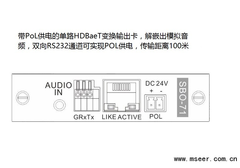 SBO-71 HDBaseT單通道變換輸出卡,配合SMD主機使用,采用獨立板卡設計,每塊卡支持1路HDBaseT輸出,可加嵌入模擬音頻,雙向RS232通道可實現POL供電,傳輸距離100米,支持最高1920x1200P60的數字高清圖像傳輸.